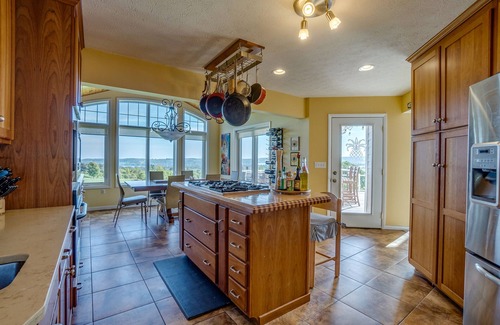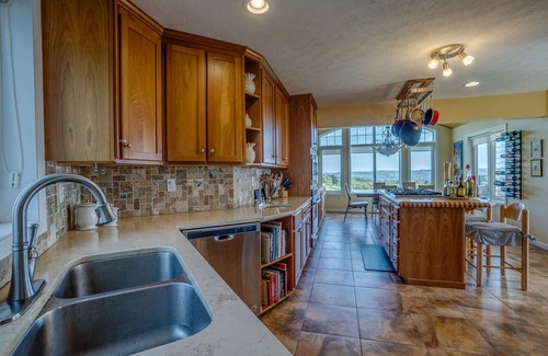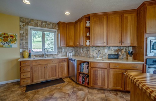 The Kitchen has many prep areas, along with a gas stove built into the kitchen island. Your guests will be able to sit up to the island while you cook and the kitchen is fully stocked with the cookware you will need to make a memorable meal. The dining area is part of the kitchen and the dining table seats 8. You can view the valley below through the large dining room windows. If you prefer grilling, there is a great outdoor kitchen area accessible through the kitchen patio door. The outdoor kitchen also has a sit-up bar area, and the deck has an outdoor dining area, gas firepit with comfortable seating, and of course the hot tub. We feel certain you'll spend most of your time out here, enjoying the outdoor living space and the view of the pond and the valley below.