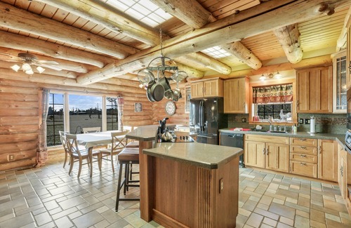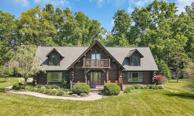 This two-story log cabin nestled in the middle of a picturesque 15-acre wooded property is the holiday destination you’ve been searching for.