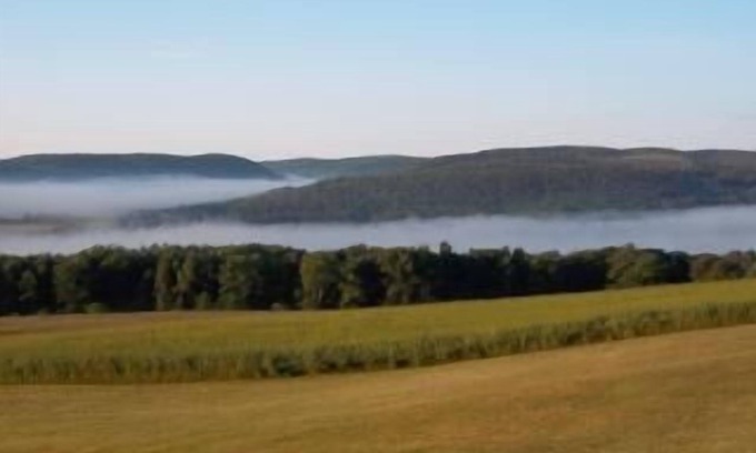We are nestled in the Finger Lakes region of New York State. Our fabulous hilltop location overlooking several lush valleys inspired our name. The Enchanted Valley View is a fully furnished guest residence with a fabulous panoramic view of the surrounding valleys. The master bedroom offers a rustic flavor with a queen size bed, flat screen TV and access to a full patio overlooking the valleys. The other bedroom is spacious with a full size bed and walk-in closet. The fully equipped kitchen has plenty of counter space, a glass top electric range, microwave, toaster, coffee maker, refrigerator and all necessary utensils. A set of french doors from the kitchen will lead you to the glass enclosed sun room that overlooks the valleys. There are patios on either side of the sun room ready for barbequing or simply relaxing in the fresh country air. The living room offers extra sleeping space with a queen size sofa bed. The large bathroom has a full size shower.