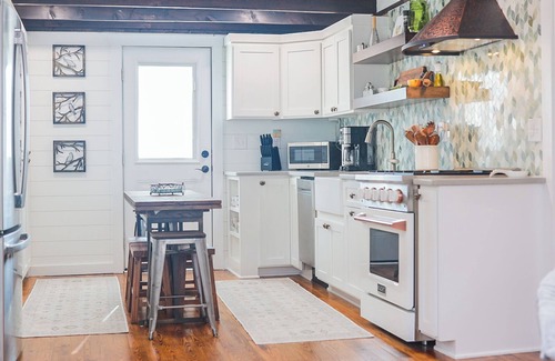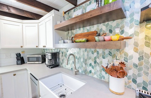 *Kitchen - WOW! Fully stocked kitchen with upscale appliances, Kutch gas stove, quartz counters, fireclay sink, amazing backsplash, open shelving, window seat and a wood dining table that folds out to create a larger table. All cooking supplies are available including spices, oil, sugar, flour and much more! Electric kettle, blender, toaster, mini waffle maker, coffee maker with all coffee supplies (creamers, sugar, sweeteners, coffee).