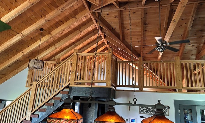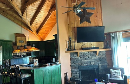 Inside our cabin unfolds into a haven of comfort & elegance w/ 3 spacious living rooms thoughtfully designed for relaxation & entertainment. 5 cozy bdrms & 3 full baths our retreat comfortably accommodates up to 16+ guests. Fully equipped kitchen complete w/modern appliances & ample counter space.
