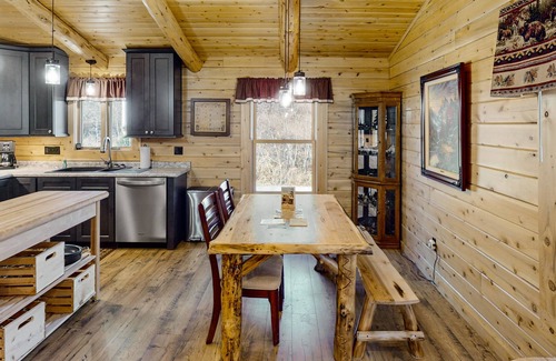 Upon entry, you'll be met with a bright, wooden interior, black bear-themed decor, and a warm feeling of welcome throughout the space. Make yourself at home in the cozy atmosphere, resting on the plush furniture, curling up with a good book by the fireplace, or streaming a movie on the large TV mounted above it. Prepare grand meals and on-the-go snacks in the full kitchen, equipped with stainless steel appliances and a quaint dining table. If you need to stay connected, a dedicated workspace with a desk and chair is available for remote work. With a King-size bed and a Queen-size bed, there's more than enough room for everyone to get a comfortable night's rest from the day's activities. Make memories around the fire table on the screened-in porch, showing off the view of the countryside.