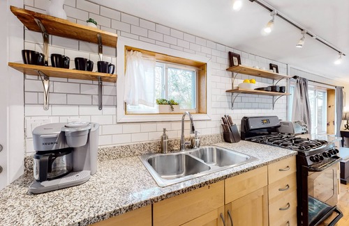 Upon entry, you'll be met with a bright interior and a warm feeling of welcome throughout the space. Relax and make yourself at home on the plush furniture by streaming your favorite movies on the large TV or curling up with a good book by the heat of the wood-burning stove. Hobby chefs will love creating culinary charms in the full kitchen, equipped with updated appliances and a breakfast bar. Get a good night's rest in the comfortable bed or sofa bed in the living area. Listen to the sounds of the creek as you sip your favorite beverage on the porch, savoring the feeling of being away from it all.