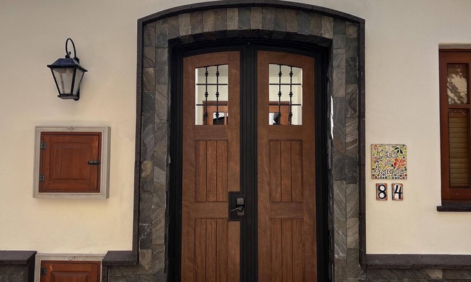 The main living area is downstairs and private. Beamed ceilings and ceramic tile give a colorful, organic feel-