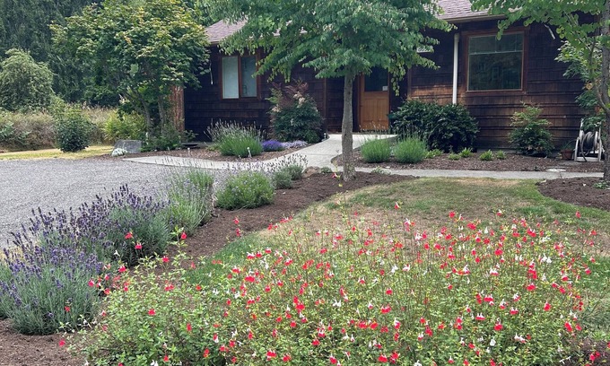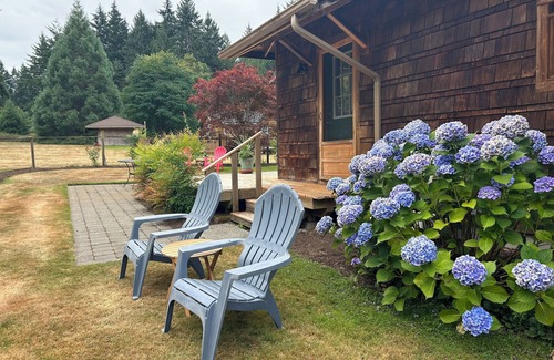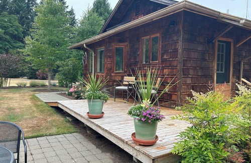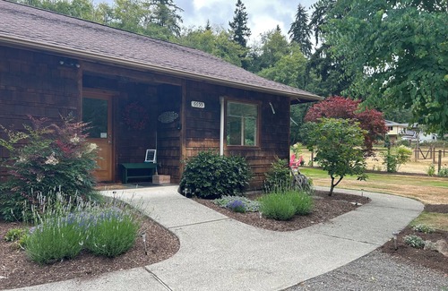 Make yourself at home in this charming 2-bedroom Whidbey Island retreat. This delightful cottage features 2 bedrooms with queen beds, a bathroom with a shower, shampoo and body wash and hair dryer. Enjoy amenities like heating and AC. Well stocked full kitchen if you are staying in to cook. Beautiful, private grounds and quiet surroundings where you can do your yoga on the porch or grass before breakfast. Enjoy your morning coffee at the table on the deck or dinner on the patio surrounded by flowers and the beautiful meadow. Curl up in one of the seating areas outside or inside in the lovely living room with a book from our small book collection. Or have fun with games and puzzles that we provide. Owners live in an adjacent home on the property. You will have complete privacy as we are across the meadow. We respect your privacy but are available if you need us. There is so much to do here on Whidbey. Hike, bring your bike or paddleboard. Island Shakespeare Festival, Django Fest, Mystery weekend. Music, wineries, breweries and restaurants. Enjoy what Whidbey island has to offer with a stay at our enchanting cottage.
