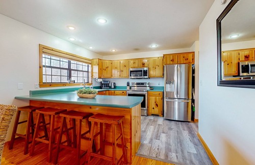 Pure bliss continues inside with a sun-filled, open-concept living area adorned with comfortable furnishings, warm wooden accents, a stone fireplace, and plenty of space to kick back and unwind. Catch up on your favorite shows, play board games by the fire, or have a fun Foosball tournament in the den. When hunger strikes, the full kitchen is well-appointed with everything you need to craft quick snacks or delicious meals. The primary bedroom is extra welcoming as the evening winds down, with plush linens and an open jetted tub for spa-like rejuvenation. Indulge in a glass of wine as you soak in the mesmerizing sunset views from the comfort of your private balcony.