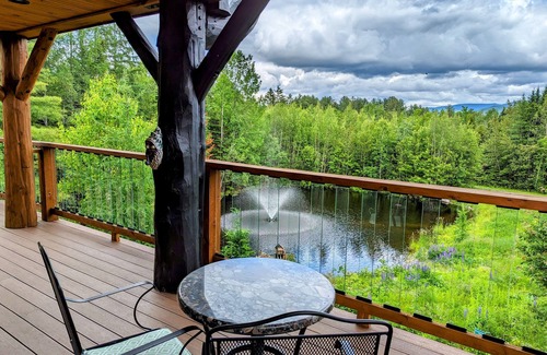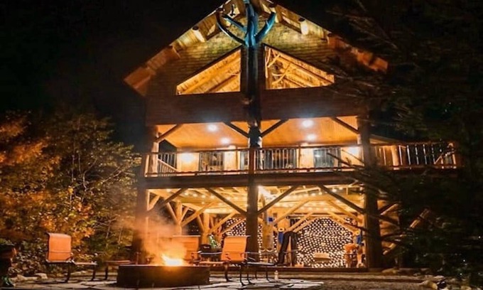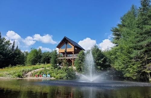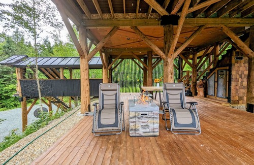 Above the Forest canopy sits an amazing Treehouse offering a peaceful, private escape, overlooking vast Mtn forest, pond and sky views! Remotely nestled on a 34-acre private oasis, while providing all the on the grid conveniences and nearby shopping. Relax by the pond, sit by the firepits (one firepit is wood fired and the other propane) amongst our wildflower garden and gaze up at the stars, toast a marshmallow, walk our private trails and catch a view of the wildlife or visit Maidstone Lake.