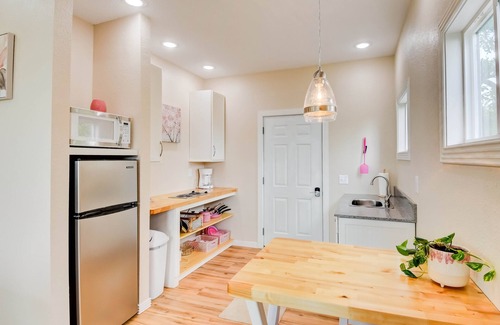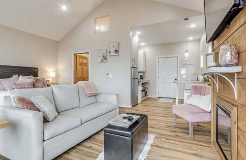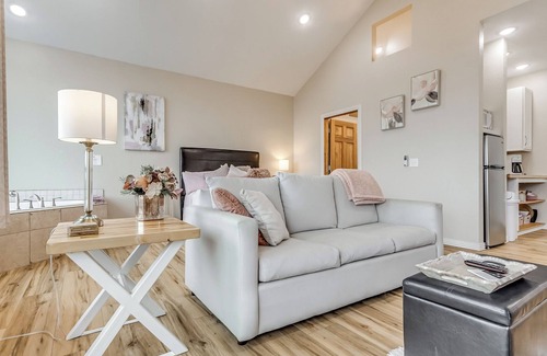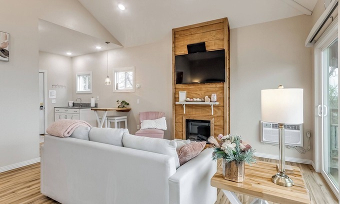 This chic spacious open studio is the perfect space for two people awaiting a lake view private getaway. A plush queen size bed, jacuzzi tub, fireplace, kitchenette, and full sleek bathroom will be at your fingertips. Fully furnished from top to bottom allows for little packing…Just food, beverage, personal items and hit the road. Parking for one car below the cabin, with access including a 100 ft upward trail and 22 stairs. A full wall of glass captures the entire lake from top of the ridge. Grill on the secluded patio and experience your own unique sunset. Wifi is provided to stay connected or sit by the campfire to disconnect. Feel a sense of security with storm shelter on site and gated entrance.