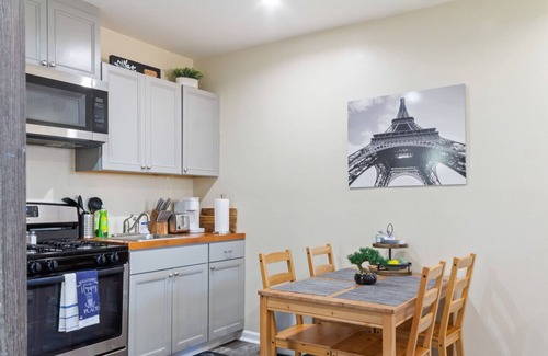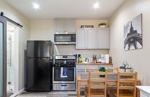 The suite is equipped with a queen bed, a full kitchen with a new stove and microwave. It offers a dining area and a living room area with a new smart television. There is an in-unit washer and dryer! The studio has a full sized closet.