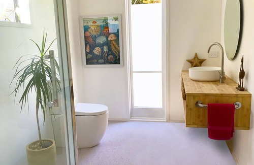 There is a large deck outside the bus, with tables and chairs for breakfast al fresco and a variety of cushions for lazy afternoons. The deck gets good morning sun and dappled shade in the afternoons. There is a BBQ alongside the deck. In front of the deck is a large lawn for your use, well planted and screened from the lane. There’s a hammock too for that afternoon snooze.