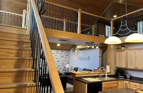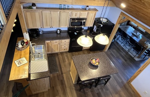 The spacious cabin has a relaxing and homey feel and accommodates up to 8 people. The Master bedroom has a king bed, and easy access to the hot tub on the back porch thru glass doors. The loft has a private bedroom with a queen bed and a twin air mattress. The loft also has a full bath and a sitting room with a futon which can be made into a twin bed. Bedroom 3 on the main floor has a queen bed. A large main floor bath serves bedroom 1 & 3 and has a large walk-in shower. All linens are provided, pillows, sheets, blankets, and towels. Comfortable seating in the Living room provides a relaxing place for good conversations, playing games or watching a movie on the smart screen. A fully stocked kitchen provides dinnerware, cookware and serving dishes for cooking your own meals if you choose to. Appliances include a fridge and stove, dishwasher, microwave, coffee maker, we have a flexbrew, [carafe and k-cups], toaster, blender, and electric tea pot. The large dining room table easily accomodates your whole group. A washer and dryer are available in the laundry room.