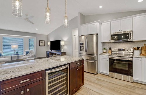 This gorgeous home with upgrades galore is new to the vacation rental market! Located in North Naples, this community is in high-demand and is perfect for anyone who'd like to be located 10 minutes from the beautiful white-sand Naples beaches, great shopping, and world class restaurants. It is 5.5 miles to Vanderbilt Beach and is 4.4 miles to Delnor Wiggins State Park! From the second you step into this newly renovated interior, you will be greeted by a light & bright open concept living space. The newly remodeled kitchen has soft close cabinets, striking granite countertops, lazy susan storage, and pull out drawers to give you ample space. Don't miss the wine fridge tucked away inside the island. Flowing gracefully from indoor to outdoor living, the expansive screened lanai offers a great space for relaxing and entertaining. You'll love how spacious the outdoor area is and will enjoy the details, with shiplap ceilings and a brand new floor. The back yard is fully fenced yard with non-heated pool and each bedroom has it's own walk in closet. The entire home is freshly painted. Time to experience the Naples lifestyle with this wonderful rental!