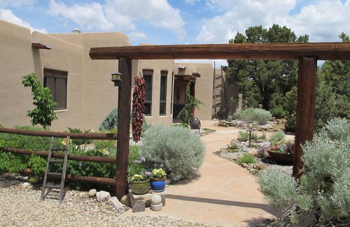 Relax in our beautiful custom 2 bedroom adobe home, located on a hillside overlooking the town of Taos. Large open concept home, perfect for entertaining. Large wrap around portal (porch) with several outdoor areas for eating and relaxing. Enjoy the sunset from the Portal, the outdoor fireplace area, or from the hot tub on the Ramada, which is accessible by a small bridge that spans the Arroyo.