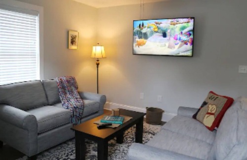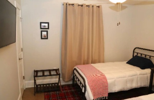 The extensive renovations of this circa 1930s home, just completed in March 2020, are a nod to styles of the era. The NC-Preservation-approved contractor made conscious and strategic choices in keeping with the styles, trends, and availability of materials during this time period. The kitchen is equipped with a refrigerator, stove, microwave, dishwasher, washer & dryer as well as basic dishes, flatware, coffee maker, and gadgets. Dining space is provided in the kitchen around the peninsula, which is an original feature of the home. Granite countertops have been added to provide a more up-to-date feeling. Bedrooms are furnished with comfy sheets, cozy comforters, fluffy pillows, and luxurious towels. In addition, each bedroom has a wall-mounted, smart TV. The full bathroom has a tub and shower. A smart TV is provided in the den along with comfortable seating for a great place for travelers to relax.