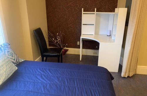 This is a 3-room suite with one bedroom (2 queens). The suite is furnished with a kitchenette including a refrigerator, coffee pot, microwave, etc. Also included is a fireplace in living room/kitchenette, 2 massage chairs in 3rd room; 2 Smart Alexa voice command TV's with netflix, a desk, and designer lighting throughout the space. This unit uses a shared bathroom with private lockable shower rooms. Free laundry room on site available to use. Three beautiful common areas with comfortable seating are also available for your use.