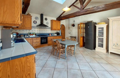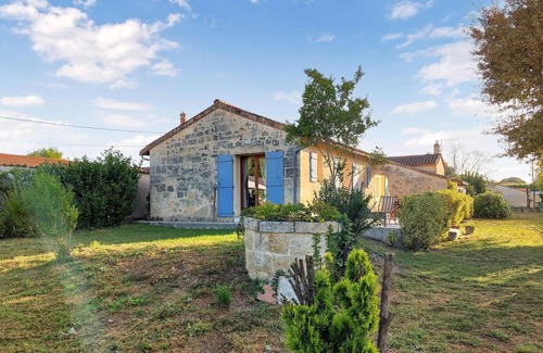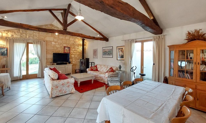 Make yourself comfortable with your loved ones in this authentic stone house, which awaits you in a wonderful location just a few steps from a lake and near Bordeaux. You will immediately feel at home in the cozy rooms. Partially exposed ceiling beams and homely furniture give the cottage its cozy charm. In the living area you can relax together on the inviting sofa and talk about the day's experiences by the fireplace before having dinner together.