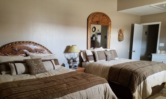 Our 'bunkhouse" has two motel rooms, this listing is for our west room. It has two queen beds so can accommodate 4 guests. Parking is right outside your door, and sometimes horses can be housed right next to your room also!