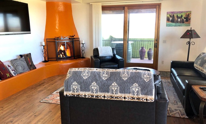 The living room has a non operational kiva fireplace. But, we have added a small fire pit in the fireplace that can be used to replicate the flames. The fuel for the fire pit is under the kitchen sink. The main couch I the living room can’t be pulled out to make a queen bed. Linens for it are in the master closet. The property has wireless internet. The television has a fire stick so you can log into you entertainment channels with your account passwords.