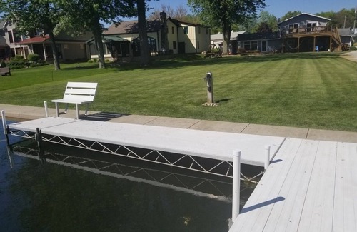 was also just remodeled and offers a twin over standard bunk bed and a large closet. Completely the 2nd floor is a full bathroom with a large jetted tub and shower. On the first floor we have a large kitchen and living room area with large ceramic tile floors and great views of the lake. The kitchen features new stainless steel appliances(side by side fridge, dishwasher, electric smooth top self cleaning stove, and toaster and microwave. The living room has a leather sofa and love seat along with a nice chair & ottoman. We also have a family room with a love seat and a desk area. Wireless wifi throughout the house. Our deck has landscape lighting that comes on and off automatically. We have a nice kayak, a paddle king paddle boat and many other floats for your use as well as a nice roll in aluminum dock. There is plenty of room to dock your boat and a public landing on the East side. We also have cable with movie channels should you decide to watch some TV.