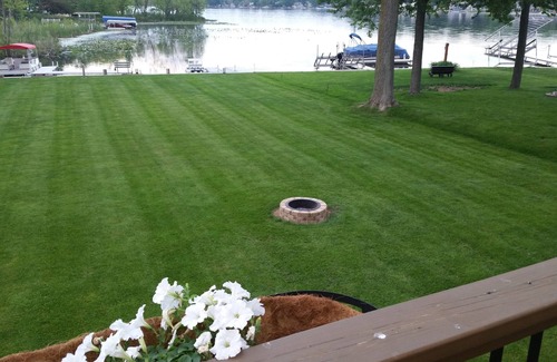 We have a very large level lake front yard with a great outdoor living space that has a large handmade Mayan family hammock (up to 600lbs) that is sheltered underneath a covered deck. Additionally we have an outdoor polished concrete and stainless steel wet bar area with a huge entertainment sink designed to fill with ice and last all day long. We also have a large custom built in outdoor enclosed shower area that is great for summertime fun . It also has a TV hook up if you need to watch a big game etc, and electrical outlets for your crock pots, chargers etc. along with a large outdoor ceiling fan to create a breeze if you prefer. We have a nice fire pit that we often enjoy towards the evenings and makes for a great conversation setting for all ages.