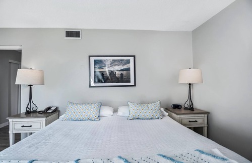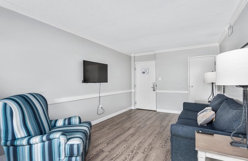 The 570 sq. ft. Master Suite is a large two-room suite with a corner view of the bay. There is a king bed with comfortable 3-inch memory foam topper for a great night sleep in a private bedroom. In the spacious front room enjoy a new queen sleeper sofa. The suite can comfortably sleep four guests with a maximum occupancy of five. Between the two rooms is the full bathroom, which has a walk-in shower, a jetted-style bath tub, and a double sink. The suite also has a small refrigerator and microwave.