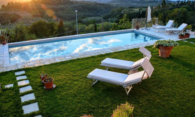 The south-west orientation of the house offers magnificent sunsets over the vineyards, the medieval abbey of Badia di Morrona and the hills as far as Pisa and the Apuan Alps.