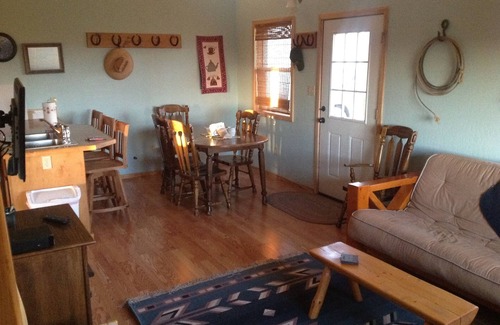 Located on 550 ac. working farm, Master Bedroom, loft (sleeps up to six), living room (sleeps 2); washer, dryer, full kitchen, outdoor patio and balcony, a pond and lots of wildlife. Sleeps 5 adults comfortably and up to 4 children (till young teenagers). There are 2 queen beds, one full bed, one twin, one futon and one hideaway available for sleeping. It is central to all major attractions. Fourteen miles north of Cortez, CO. 1.5 hours from Durango, CO, 1 hr. to Telluride, CO or 1.5 hrs. Moab, UT, 3/4 hr. to Mesa Verde, Anazasi ruins in close vicinity to cabin. The cabin is within easy travelling to some of Colorado's best biking and hiking areas. We are 18 minutes from Phil's World, which is rated in Colorado's best trails. Boggy Draw is 20 minutes away which is an area many of our locals go to. Mesa Verde Country.com lists nine trails with over 600 miles in our area. Some of our guests come to do fishing on the Dolores River, which is about 15 minutes away. Whichever activity you choose, you will find there is always more you can do.