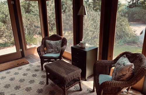 Mornings invite quiet reflection on the screened porch or rocking chairs on the patio while enjoying a warm Nespresso at sunrise. Evenings offer fun and s’mores around the fire pit and shared meals at the outdoor dining table, all while hearing the calls of loons from the pond.
