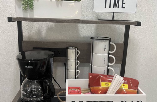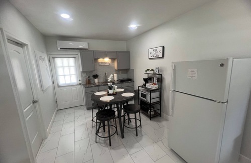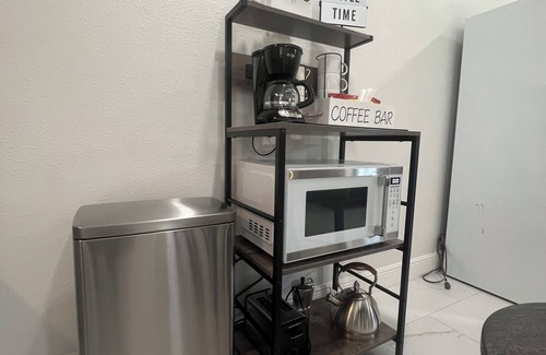 - the space includes a full kitchen with fridge, microwave, coffee maker, stove, blender , rice cooker, cooking pots, wine glasses, plates and utensils, etc . As well as a place for 4 people to enjoy a meal.