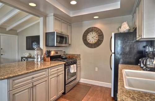 This downstairs Getaway has a full kitchen with granite counters, new appliances, dining area, hard wood floors throughout and a spacious outdoor patio complete with seating and barbecue! Both bedrooms are complete with luxurious bedding, ceiling fans, and Large flat screen TVs with cable for your vacation enjoyment. 1 Bedroom has a King bed and 1 has a Queen bed with sofa bed in front room that sleeps 2. Other amenities include high speed wi-fi, front room large flat screen TV, DVD player, cable, Netflix, coin operated washer/dryer in the laundry room located beside the garage. Beach enjoyment includes umbrella, ice chest, wagon, boogie boards, beach towels and 2 beach chairs.