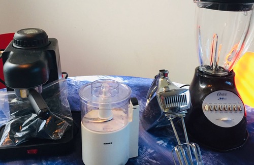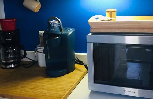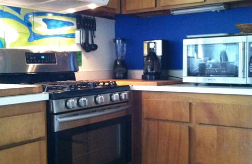 Our kitchen is fully-equipped eat-in with gas stove, dishwasher, hot water kettle, microwave, refrigerator with freezer top, blender, espresso machine, toaster, new range fan etc.