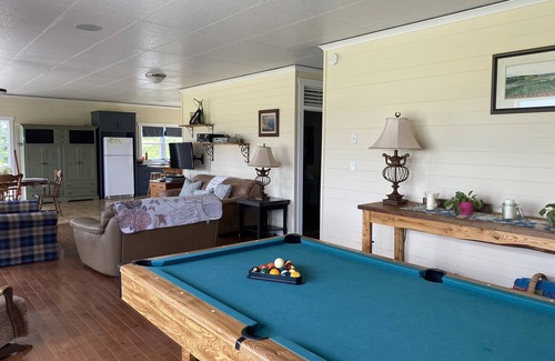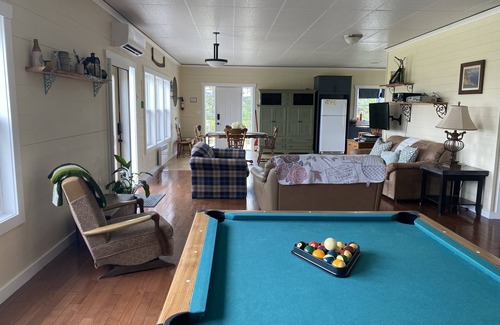 The 2-bedroom cottage is an open concept layout. The full-size kitchen complete with an 11-foot butcher block countertop island is a definite highlight. Plenty of natural light filters in through the large windows covering the Southeast wall. As well, a built-in sound system and pool table create a nice party atmosphere. Feel free to hook up your iPod and play your favorite tunes! The spacious master bedroom contains a queen size bed and ample closet space. The second bedroom has a set of twin/double size bunk beds and a queen bed. There is also a full couch and love seat in the living room. The dining table seats 6, and if more space is needed, the outdoor patio set also seats 6. Wifi and satellite TV are included. There is also a laundry room with washer and dryer. Newly installed this year, heat pump to provide cooling and heating.
