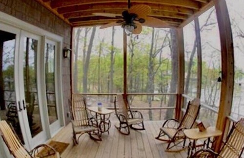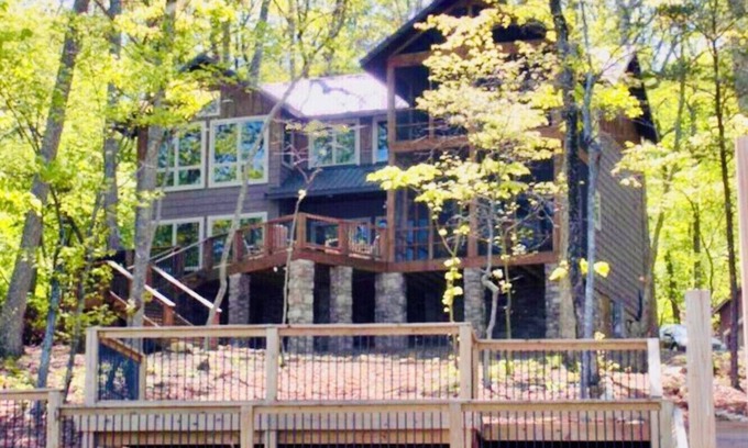 Beautiful rustic, yet sophisticated house built in 2008. It is on a large wooded lot on the main channel of the lake with a really big water view. The best sunset view is from the upper screened-in porch, with the trees silhouetted in between. Blue herons, cranes, and many other birds and wildlife. Hike to the dam on a trail through the woods; enjoy sitting on the dock or swimming and boating off the dock in the summer.
