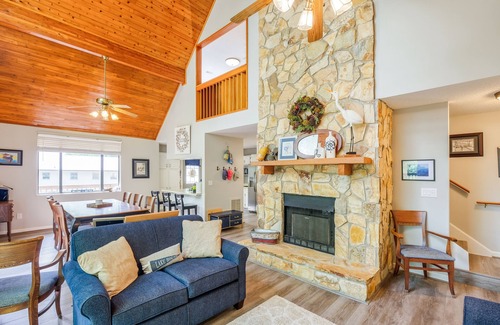 The property features five beautifully appointed bedrooms, comfortably sleeping up to 12 guests—with options like a king bed, three queen beds, and a cozy double bed. Guests will enjoy full bathrooms on each floor, perfect for wedding preparations. The family loft and basement playroom provide ample space for relaxation and entertainment, while the expansive outdoor deck and covered patio offer breathtaking views of the lake. A private two-level dock with a swim platform invites swimming and fishing, and the included kayaks and canoe make exploring the lake a breeze. Gather around the fire pit for intimate evening celebrations beneath the stars.
