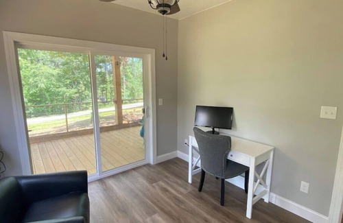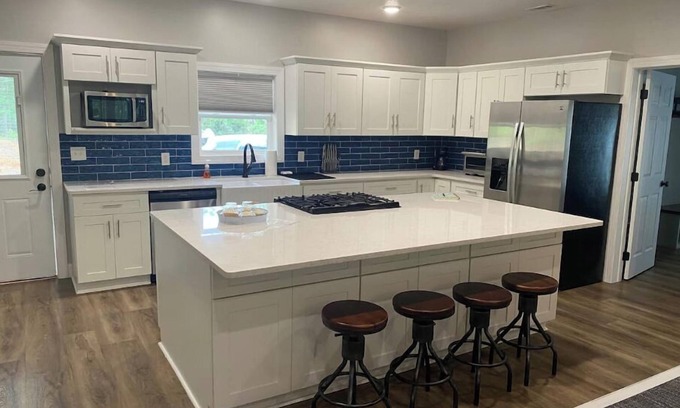 Enjoy a short walk to the lake, quiet nights on the deck, play cornhole outdoors with our new boards, spot American Bald eagles flying by, and family time around the island and locally hand-built dining room table.