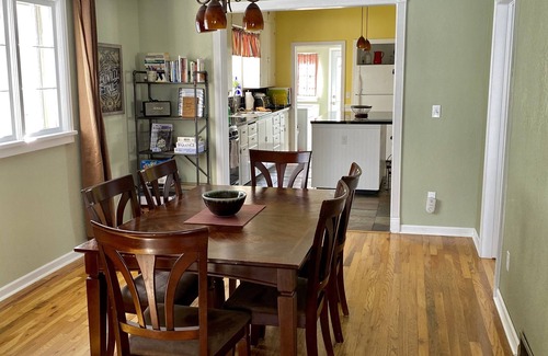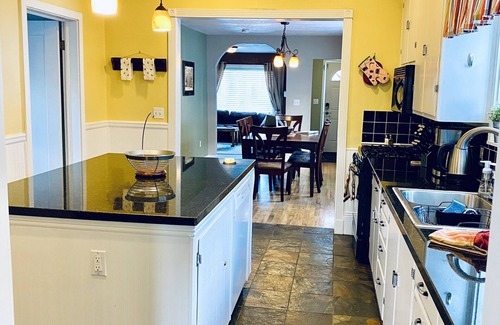 Built in 1882, it has a mix of new and old. The home comfortably sleeps 4 but can accommodate up to 6. Both bedrooms have queen beds with hybrid mattresses. There is a sleeper sofa that can accommodate 2 extra guests if needed and a pack-n-play for the wee-little ones. The en-suite bathroom is a full bath and the 2nd bathroom is a 3/4 bath. All linens, towels, and TP are provided for your comfort.