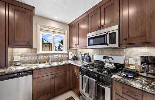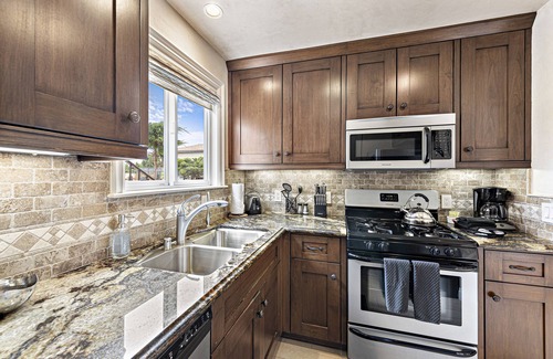 The plush beige suede futon is ready to house extra guests in the living and dining area. You'll find a glass dining table there, designed to make it easy to accommodate everyone. The gourmet kitchen is beautifully outfitted with stainless steel appliances and granite countertops set against our custom mahogany wood cabinetry.