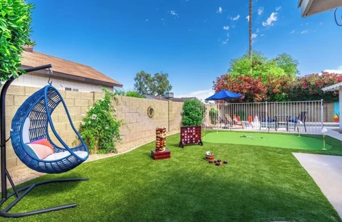 Welcome to this Scottsdale getaway! Your vacation starts when you arrive at this bright, fun, and perfectly designed home for large groups and families in mind. When you are not dining out, shopping or golfing, enjoy the large outdoor space in this resort oasis that features the comforts of covered outdoor patio, a sparkling pool oasis, a cozy fire pit, a relaxing hot tub, a 4 hole practice putting area, a BBQ grill and outdoor patio lights to create the perfect setting for relaxation and fun.