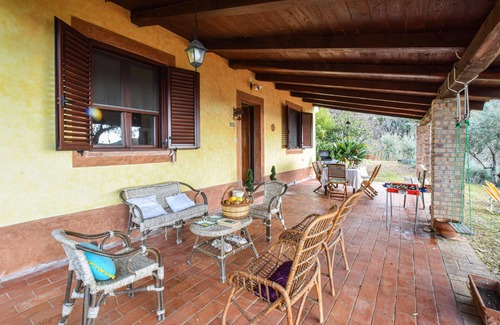 Welcome to this inviting vacation home, which welcomes you in an elevated position above the Calabrian coast and offers ideal conditions for a fantastic family vacation near the sea. The ambience of the house is homely, its rustic charm comes from solid wooden furniture and tiled floors, here you can make yourself comfortable together. In the evening, make yourself comfortable on the sofas and listen to the crackling of the flames in the fireplace.