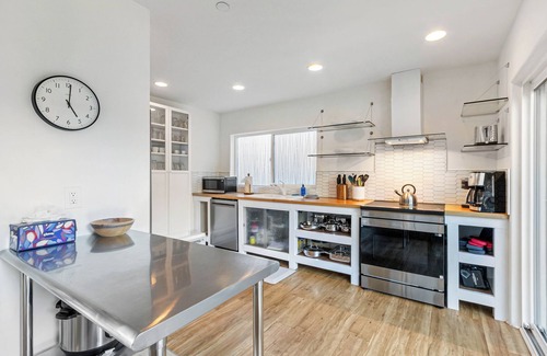Kitchen: The Eurostyle kitchen is clean and simple, featuring an electric stove, modern cabinetry, and ample counter space.