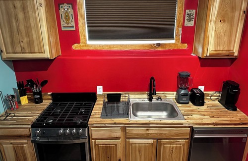 Fully Equipped Kitchen: Prepare meals with ease using a full-sized refrigerator, stove, microwave, Keurig coffee maker (with complimentary coffee), cooking utensils, and pots/pans—perfect for cozy dinners or morning coffee.