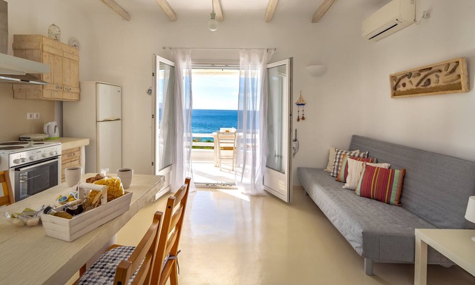 Brand new 'Mykonos style' villas directly opposite the beach with stunning views over the 'Gulf of Karystos' and over several amazing bays make this villa a great retreat to relax and enjoy sun, beach and sea. The villa is equipped with a modern kitchen and a large open plan living area as well as a private terrace and balcony. You will find all you need for a relaxing time.Perfect beach retreat with lots of hidden and lonely bays that you can have all for yourself.