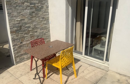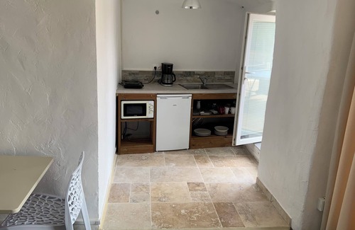 Large studio with private terrace and pool access (not private). Near all shops 15 minutes walk from the beach old port and city center: car not useful. Possibility closed parking to see on the spot. Barbecue available. The neighborhood where the apartment is is like a village with all its shops a great super u is nearby without the need to take the car.