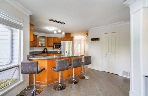 Escape to this marvelous house in picturesque Surrey. With 4 cozy bedrooms and 3 bathrooms, this cool retreat offers a spacious living room with a comfy futon for extra guests. Feel right at home with heating, AC, iron, and a hairdryer provided. Fall in love with Surrey and enjoy the magic it has to offer.