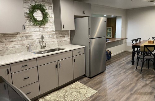 In the house there is a large living area that has views of Enterprise Lake and a large wood-burning fireplace. A deck extends from the living room through sliding patio doors on the lakeside. The dining area is open to the living room as well. There is a small kitchen (refrigerator/freezer, stove, and microwave) and there are two bedrooms (each with a queen bed and a closet). There is a queen sleeper sofa in the living room. We remodeled the bathroom in 2024. We offer contactless check-in and check-out with our smart lock. We do not charge an additional cleaning fee.