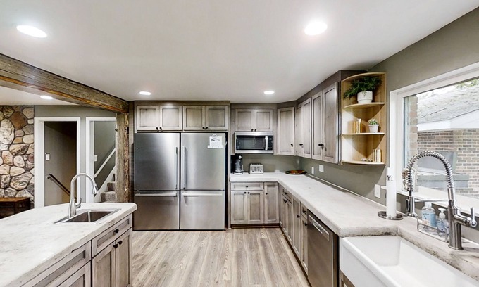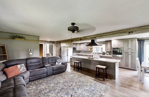 Quiet and comfortable moments can be spent in the open-concept living room and kitchen. Featuring stainless steel appliances and ample meal prep space, the full kitchen is sure to impress the chef of your family! When you need a moment to yourself, the five bedrooms are equally comfortable all lined with soft linens and central air. Additional interior features you'll love include a wood-burning fireplace and internet access.