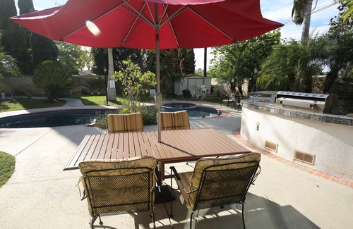 A black bottom pool with Jacuzzi is most refreshing during the summer months. Optional pool heating is available at cost of utilities. Ideal for entertainment and family gathering: a large BBQ island, complete with sink and separate cook top. Plenty of outdoor furniture to accommodate dozens of guests. In Southern California, we mostly dine in our backyard because we almost never see a BUG.