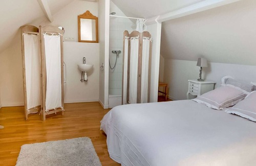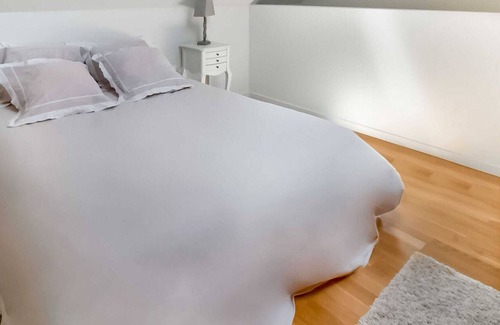 On the 1st floor: (bedroom(double bed(twin duvet, twin fitted sheet, 140 x 200 cm), TV), bedroom(2x single bed(duvet, fitted sheet, 90 x 200 cm)), Bedroom with bathroom(double bed(twin duvet, twin fitted sheet, 140 x 200 cm), shower, washbasin, toilet), Bedroom with bathroom(double bed or 2 single beds, shower, washbasin, toilet), bathroom(bath tub, shower, washbasin), sanitary facility(toilet))