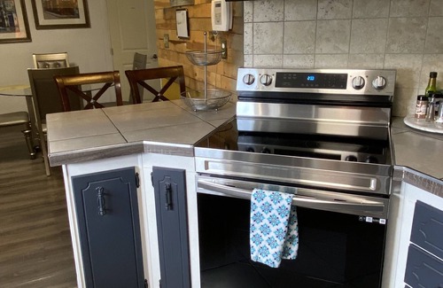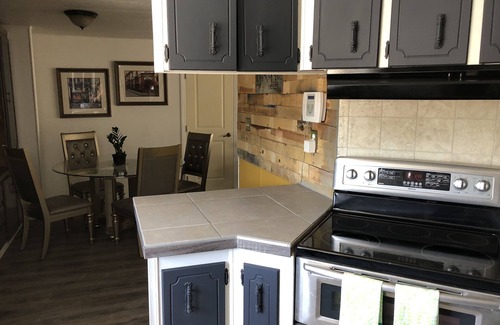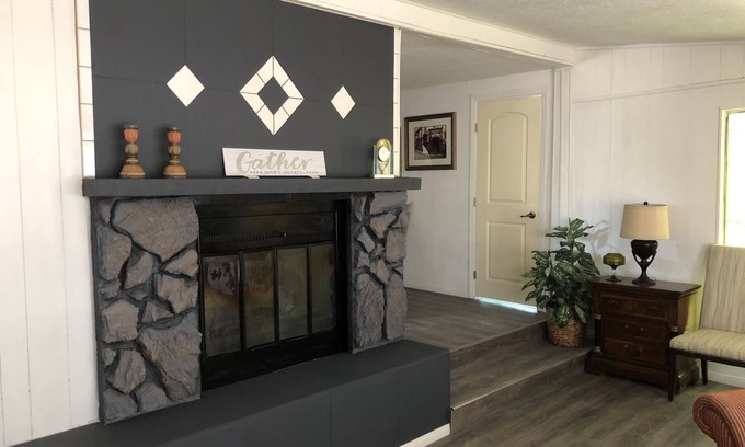 While staying in our double wide trailer home you’ll be able to enjoy the beautiful desert sunsets and unobstructed mountain views all situated within a quiet rural neighborhood setting and also the reason we chose a fashionably rustic look for the kitchen... and is newly remodeled.