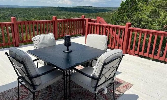 Entire 2br 2ba hilltop view home Sleeps 8 pets 4 acres Jacuzzi Central AC Kingbeds Office Free WiFi Parking Full Kitchen Refrigerator Washer Dryer Furnished Three 3 Large Sunset Dining Patios Grill Stovetop Oven Hiking Wildlife Firepit Quiet very Secluded is located in Marble Falls.